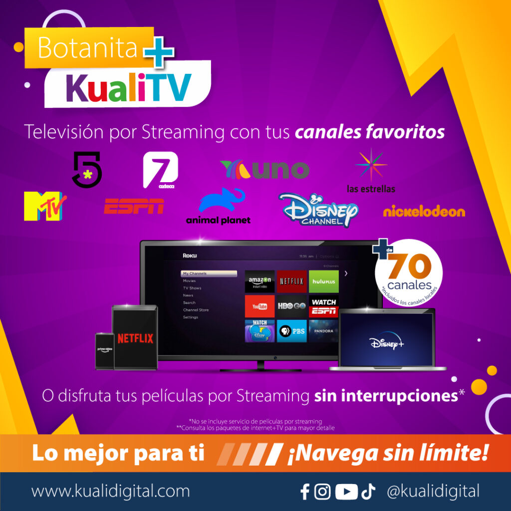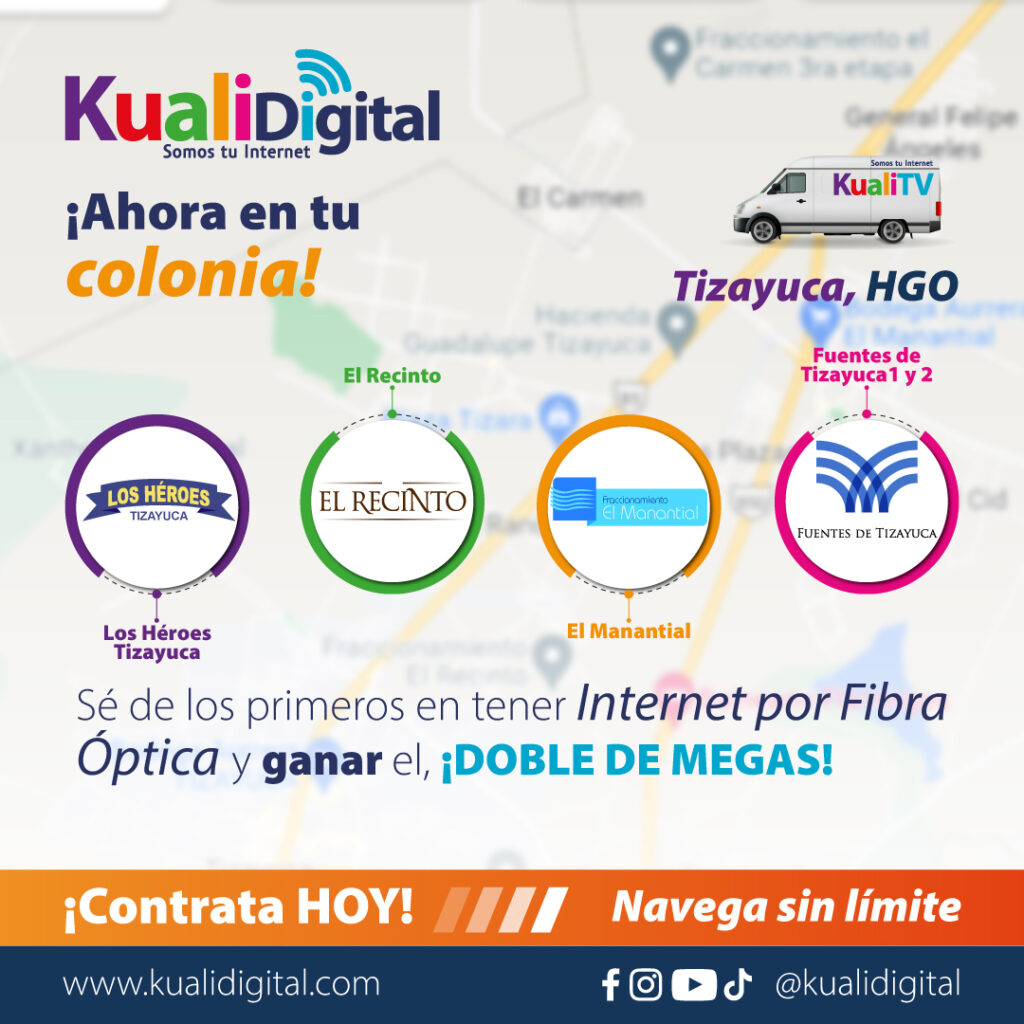 Kualidigital es una empresa 100% mexicana especializada en ofrecer servicios de conectividad a internet y TV a través de fibra óptica. Actualmente tienen presencia y operan en los estados de Hidalgo, Quintana Roo y Morelos.